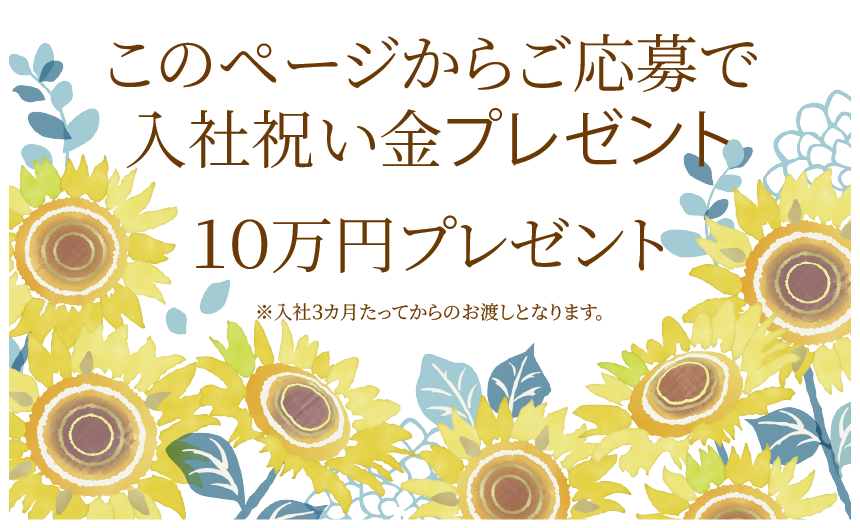 ひまわり訪問看護リハビリステーションでは、入社祝い金として入社3か月後に10万円をプレゼントするキャンペーンを開始しました。